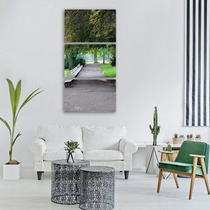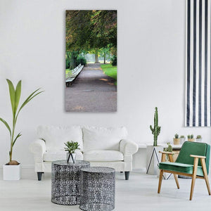 This canvas shows a realistic landscape: a park path flanked by trees and a row of empty benches, with dappled sunlight filtering through the leaves. Soft greens, browns, grays and whites create a peaceful, serene mood that suits modern, nature-inspired rooms and simple wall decor.
