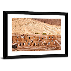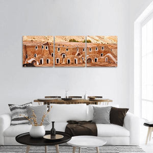 Berber Dwelling Matmata Panoramic Canvas Wall Art shows an ancient stone building set into a dry hillside, with arched entrances and small rectangular windows. The panoramic composition and warm palette of browns, tans, ochre, white and touches of green create a historic, arid, serene mood. It suits architectural, earth-toned, or rustic interiors looking for a calm landscape focal point.