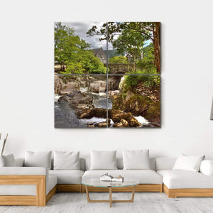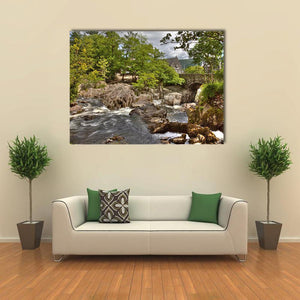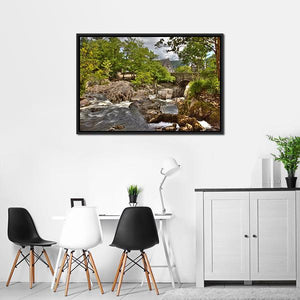This landscape canvas art features a serene stone bridge arch over a gentle river, surrounded by lush trees and smooth rocks. The calming palette of greens and browns evokes a natural atmosphere that beautifully complements any room's décor.