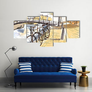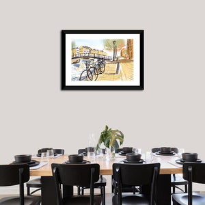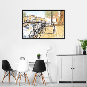 This canvas art captures a vibrant urban scene of bicycles against the backdrop of Amsterdam. The sketchy, impressionistic style combined with sunny blues and yellows evokes a peaceful, inviting atmosphere.