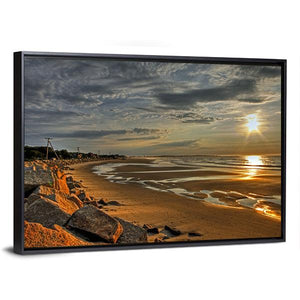 Biddeford Pool at Sunrise captures a quiet coastal scene with rocky shoreline, tidal pools, and a dramatic, cloud-streaked sky. Warm oranges and cool blues set a serene, peaceful mood that suits rustic or nature-inspired rooms. The composition uses depth and the rule of thirds to lead the eye along the shore.