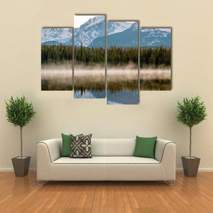 Bierstadt Lake Canvas Wall Art shows a calm morning scene with snow-capped mountains, a dense pine forest, and mist rising from a glassy lake. The realistic greens, blues, whites, and browns create a cool, peaceful mood that suits home living spaces and modern room decor.