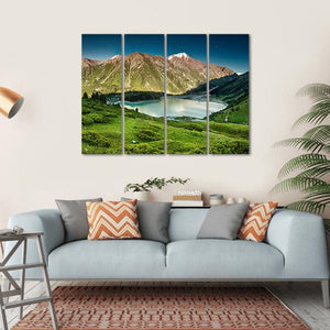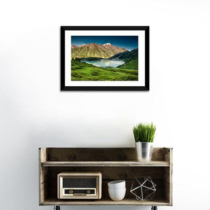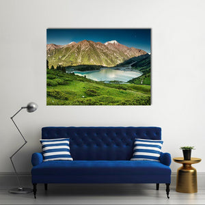 This canvas art captures the serene beauty of Big Almaty Lake, surrounded by majestic mountains and lush green hills. The tranquil scene features a clear blue sky and light reflecting off the water, perfect for bringing a peaceful touch to your home décor.