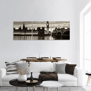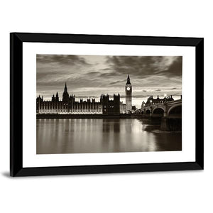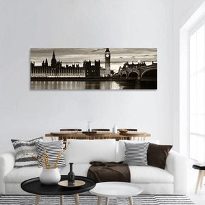 This panoramic monochrome print captures Elizabeth Tower (Big Ben), the Palace of Westminster, Westminster Bridge, and the River Thames with a prominent clock tower and reflected arches. The image feels historic, grand, and serene with a subtle vintage/sepia tone, suited to modern or vintage interiors as a cityscape focal point.