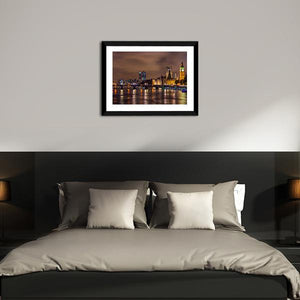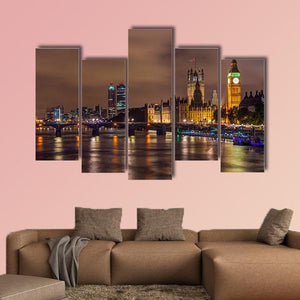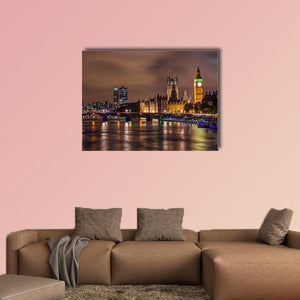 A photographic cityscape of Westminster Bridge and the London skyline at night, featuring Big Ben and Parliament set against dark blues and warm yellow lights. Reflections on the river and illuminated buildings create a calm, nighttime atmosphere. Suits modern living rooms or travel-themed wall décor.