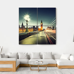 This canvas art captures Big Ben and the Houses of Parliament, bustling with life through vibrant traffic trails and illuminated streetlights. The dynamic urban scene evokes an energetic, nocturnal atmosphere, making it a captivating addition to your space.
