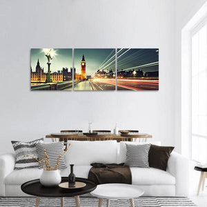 Big Ben From Westminster Bridge shows Big Ben and Westminster Bridge in a panoramic London skyline with a glowing clock tower and long-exposure light trails. The modern, abstracted composition and blue-orange palette create an energetic, urban atmosphere that works well in contemporary living rooms or home offices.
