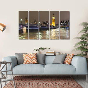 Capture the essence of London with this stunning canvas featuring Big Ben, Westminster Bridge, and the River Thames. The vibrant nocturnal scene showcases lights reflecting on the water against a rich palette of gold, brown, blue, and white, creating a reflective atmosphere perfect for urban decor.