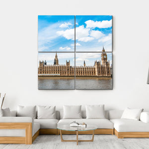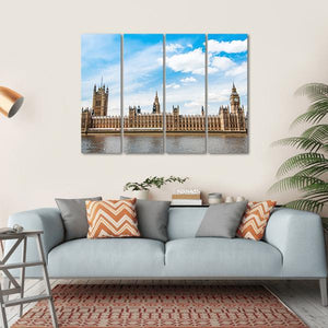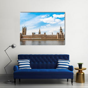 Capture the essence of London with this stunning canvas wall art featuring Big Ben, the Palace of Westminster, and the River Thames. The photorealistic depiction in a wide angle reveals a historic and grand urban scene, beautifully rendered in shades of blue, tan, and grey against a partially cloudy sky.