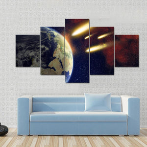 This canvas art features a stunning view of Earth complemented by flying asteroids and a fiery nebula. The dramatic colors of blue, orange, and yellow create a cosmic atmosphere that adds depth and intrigue to any space.