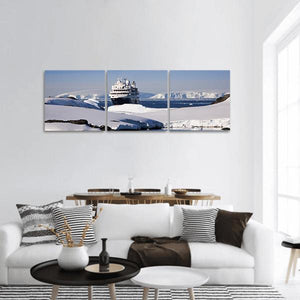 A photorealistic panoramic of a large cruise ship navigating Antarctic ice, surrounded by icebergs, snowy plains, and distant mountains. Cool blues, whites, greys, and muted browns give the scene a cold, vast, and serene feeling, suited to modern or nautical-themed rooms that need a calm, isolated landscape focal point.