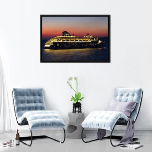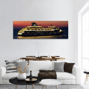 A photorealistic panoramic canvas showing a cruise ship on the ocean at night, bathed in sunset hues of orange, yellow and deep blue. The illuminated ship, its many yellow-lit windows, and the calm water create a serene, majestic mood that suits modern or coastal living spaces.