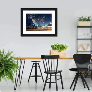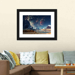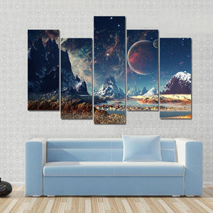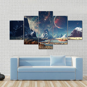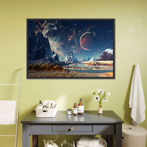 This vibrant canvas captures an alien planet with majestic mountains beneath a starry sky. The deep hues of blue, red, and orange create a mysterious and cosmic atmosphere, making it a stunning addition to your wall decor.