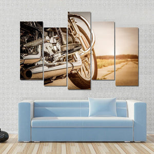 This canvas captures a close-up view of a motorcycle engine and exhaust pipes, evoking a powerful and rugged atmosphere. The industrial vintage style paired with a chrome and brown palette gives it a unique charm.