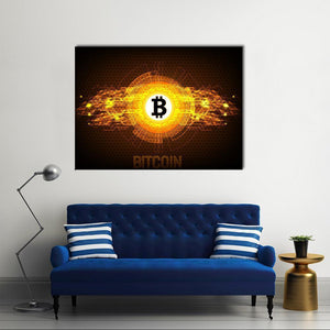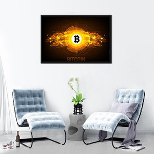 This electrifying canvas art features the iconic bitcoin logo at its center, surrounded by an abstract digital design. With a dynamic palette of gold, orange, and black, it adds a touch of futuristic flair to any space.
