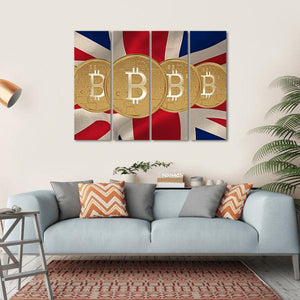 This modern canvas art features four golden bitcoin coins with the 'B' symbol, partially overlapping a vibrant Union Jack flag. The combination evokes a sense of financial pride and patriotism, making it a memorable centerpiece for your wall decor.