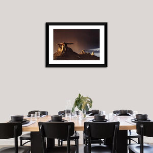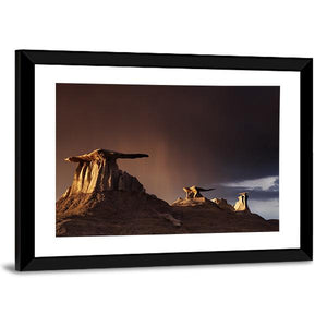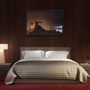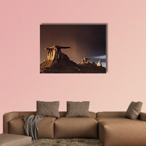 Bizarre Rock In Bisti Badlands depicts weathered rock formations beneath a stormy sky, lit by dramatic shafts of light. The rule-of-thirds composition and a brooding palette of brown, tan, dark gray and orange give the scene an ominous, powerful mood. This canvas print suits modern living rooms or nature-focused wall decor.