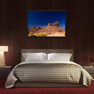 Bizzare Rock Formation Algeria Canvas Art shows weathered rock spires rising from a dry desert plain in a wide, realistic landscape. The blue, brown, tan and green palette creates an arid, desolate and majestic mood; it suits modern living rooms, studies or hallways as nature-focused wall decor.