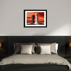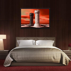 This canvas wall art features two rooks on a chessboard, showcasing a dramatic and intense atmosphere. With its striking palette of red, brown, gray, and white, it adds a touch of strategic elegance to any space.