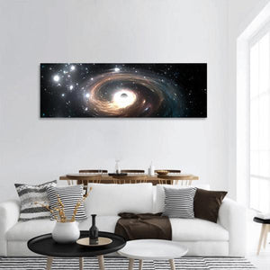 Black hole with a swirling accretion disk, glowing gas clouds, and distant stars forms a panoramic, spiral scene that feels cosmic and mysterious. Rendered in blacks, golds, blues, and whites in a modern abstract style, the piece adds depth and presence to modern or contemporary rooms like living rooms and home offices.