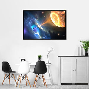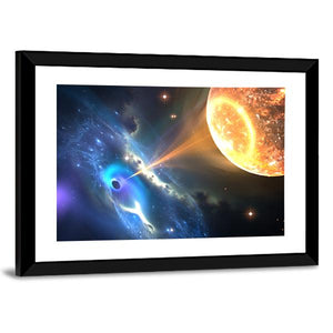 Dive into the awe-inspiring depths of space with this vibrant canvas art featuring a black hole consuming a nearby star. The dramatic colors of blue, orange, and purple create a modern, abstract piece that evokes a sense of cosmic wonder.