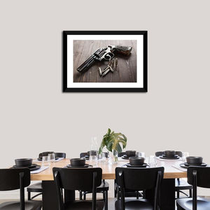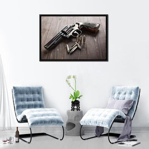 This striking canvas art features a close-up view of a revolver and bullets, evoking a tense and dramatic mood. The rich palette of browns, blacks, and grays highlights the metallic sheen of the bullets and the textured wooden surface, making it a compelling piece for modern decor.