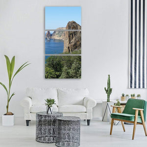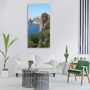A realistic view of coastal cliffs along the Black Sea, with calm water, clear sky and dense green vegetation in the foreground, conveying a serene, majestic natural scene. The composition highlights rock formations and an ocean vista, using a blue, green and tan palette that suits coastal or nature-inspired room decor.