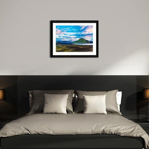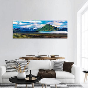 A panoramic nature photograph of Blahylur Lake in Iceland, featuring a conical green mountain, textured rolling hills and a calm lake beneath a dramatic sky. The cool greens, blues and greys give the scene a serene, majestic, and vast mood, a quiet focal point for modern or nature-inspired rooms.