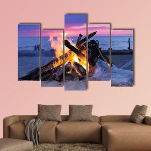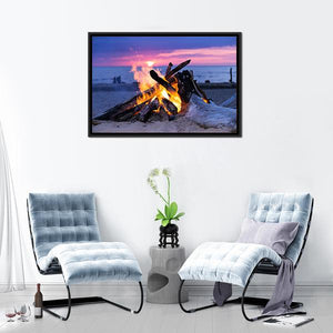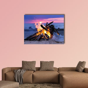 This canvas captures a beach bonfire at sunset, with glowing embers and driftwood along the ocean shore. Warm orange, pink, and purple tones create a serene, tranquil mood, suitable for coastal or rustic room decor.
