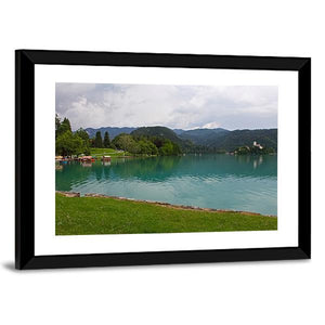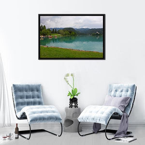 Bled Lake With Church Canvas captures a lakeside landscape featuring a church, mountains, trees and several small boats beneath a cloudy sky. Composed with a rule-of-thirds balance in a realistic style, the blue, green, gray and white palette creates a peaceful, serene mood. It suits modern or nature-inspired rooms as a quiet focal point.