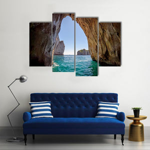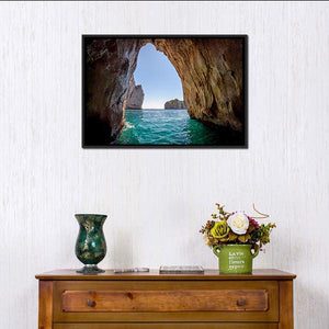 This stunning canvas captures the serene beauty of Italy's Blue Grotto, showcasing the ocean and rock formations through a photorealistic lens. The interplay of blue, brown, and sunlit water creates an awe-inspiring atmosphere, perfect for bringing a touch of nature into your space.
