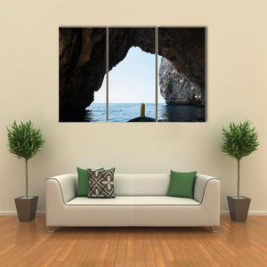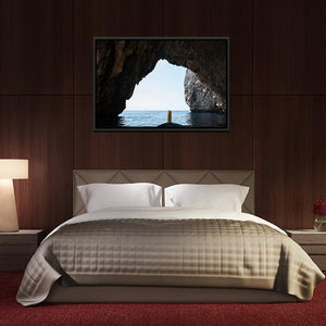 This photorealistic canvas art captures the tranquil beauty of a sea cave, featuring the bow of a small boat in the foreground. With a serene palette of blue, gray, and white, it evokes a sense of adventure and vastness, making it a stunning addition to any space.