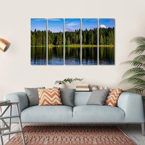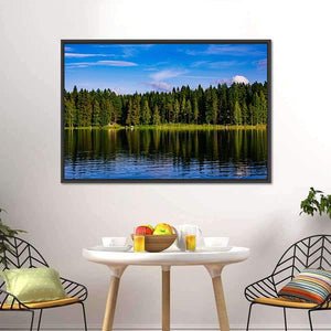 This canvas art features a serene landscape of a tranquil lake, surrounded by a dense evergreen forest under a blue sky. With peaceful reflections on calm waters, it brings a touch of nature’s beauty into your space.