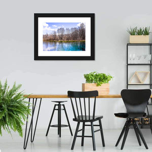 Explore the calm beauty of a serene lake scene featuring bare trees, clear blue water, and a cloudy sky. This photorealistic landscape captures the essence of nature, making it a lovely addition to any room decor.