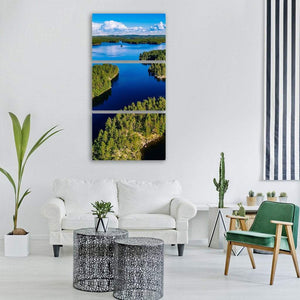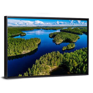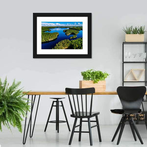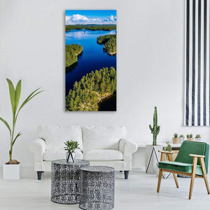 Aerial landscape of a clear blue lake tucked among dense green forest and small islands under white fluffy clouds; the view feels serene and peaceful. This nature photography print suits modern, nature-focused rooms like living rooms, bedrooms, or home offices.