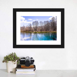 Blue Lake Of Kazan depicts a calm lake with bare deciduous trees on the far bank and a clear reflection, named for Kazan. Rendered in blues, browns, white and soft green, the realistic scene feels peaceful and serene on a spring or autumn daytime. It suits modern or nature-inspired rooms and quiet living spaces.