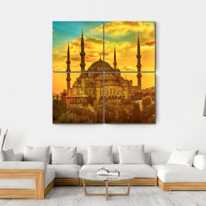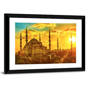 Capture the serene beauty of the Blue Mosque at sunset with this canvas wall art. Vibrant hues of orange, yellow, and blue create a majestic atmosphere, highlighting the intricate details of domes and slender minarets amidst tranquil trees.