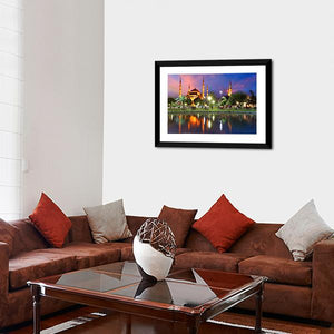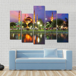 Experience the serene beauty of the Blue Mosque under a vibrant twilight sky. This canvas art captures the mosque's stunning minarets and dome reflecting in the tranquil waters, bringing a touch of Istanbul's charm to any space.