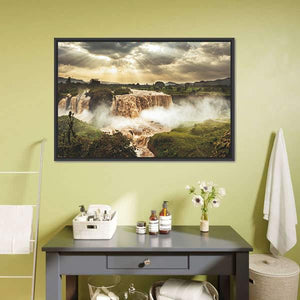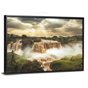 Blue Nile Falls in Ethiopia presents a wide, cinematic landscape of a powerful waterfall and the Nile river, with mountains and vegetation in the foreground. Sunbeams break through clouds and mist rises from the falls, creating a dramatic yet serene atmosphere ideal for modern home decor.