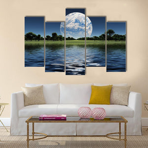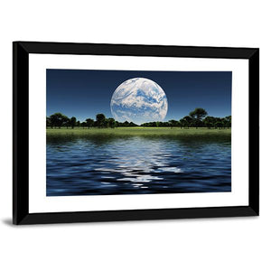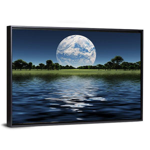 Blue Planet On The Horizon Canvas presents a surreal, serene landscape: a blue Earth on the horizon above calm water, with trees along the shore and clouds visible on the planet. The rule-of-thirds composition and blue-green palette create a tranquil, cosmic mood with the planet reflected in the water. It suits modern home decor and makes a quiet focal piece for room wall art.
