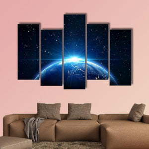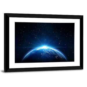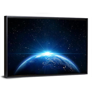 This photorealistic canvas shows Earth from space at sunrise, with city lights and distant stars setting the scene. Deep blues, blacks, soft whites and a touch of yellow create a vast, serene mood that fits contemporary living rooms or offices.