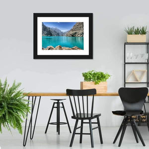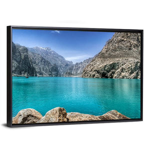 This canvas art captures the serene beauty of Attabad Lake in Pakistan, featuring crystal blue water framed by majestic, snow-capped mountains and rocky landscapes. Its vibrant colors invite a tranquil atmosphere, making it an excellent choice for any room decor.