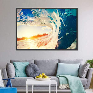 Experience the dynamic energy of an ocean wave crashing against the shore at sunset. This vibrant canvas art captures the frothy water and sunlight breaking through, creating an awe-inspiring atmosphere. Perfect for adding a touch of nature's beauty to your wall decor.