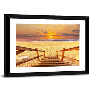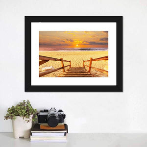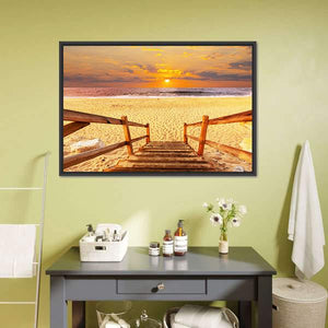 Realistic canvas print of a wooden walkway leading down to the beach and ocean at sunset, shown from a straight-on perspective. Warm golden and orange tones with blue and brown accents and soft clouds create a calm, serene mood, suitable for beach-themed, modern, or nature-inspired room decor.
