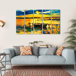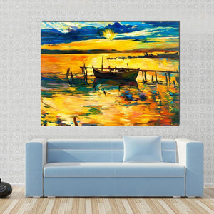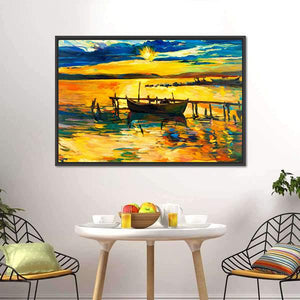 This vibrant canvas art features a serene scene of a boat and dock at sunset, framed by textured brushstrokes in warm hues of orange and yellow. It captures the calmness of water, making it a beautiful addition to your art collection.