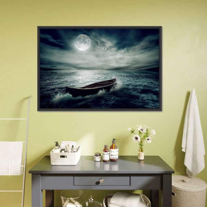 This canvas artwork features a solitary boat navigating a stormy ocean under a full moon, surrounded by a flock of birds. The deep blues and greys create a dramatic atmosphere, evoking a sense of serenity mixed with mystery.