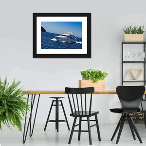 A white yacht cuts through deep blue water in this panoramic canvas, composed using the rule of thirds to feel energetic yet peaceful. The blue, white, and gray palette and modern style suit coastal or contemporary rooms. Daytime motion and the yacht’s wake give a sense of scale and quiet luxury.