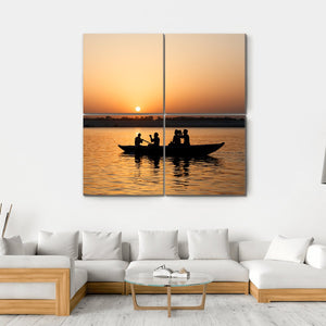 Capture the serene beauty of a sunset on the Ganges River with this striking canvas art featuring a boat and silhouetted figures. The warm palette of orange, gold, and brown brings a peaceful atmosphere to any space.
