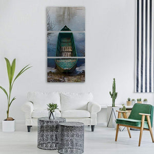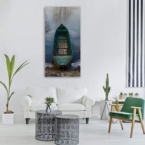 A realistic depiction of a lone boat resting on a calm river, with wooden seats visible and bare branches on the left. Muted greens, blues, browns and grays create a quiet, wintry, slightly lonely mood that suits modern or nature-inspired rooms.