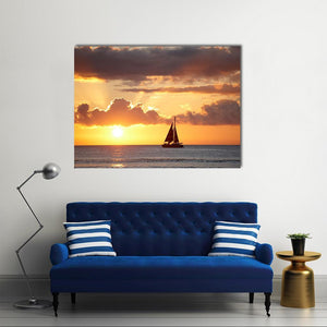 This canvas wall art features a serene sailboat on a tranquil ocean at sunset, showcasing a vibrant palette of oranges and blues. The reflection on the water adds depth to this modern piece, making it a wonderful addition to any space that seeks a peaceful atmosphere.
